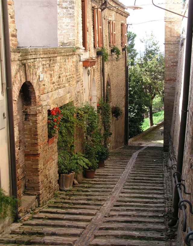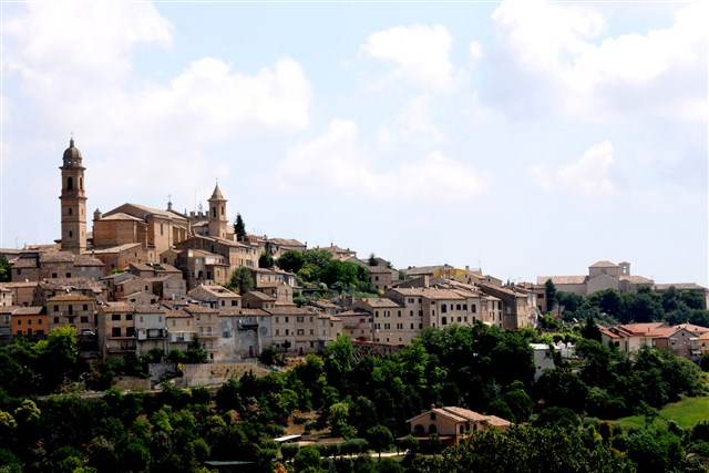 Morrovalle, a town of 10,000 inhabitants, stands on one of the many hills surrounding the Chienti river valley. The panorama stretches from the Sibillini Mountains to the Adriatic Sea.